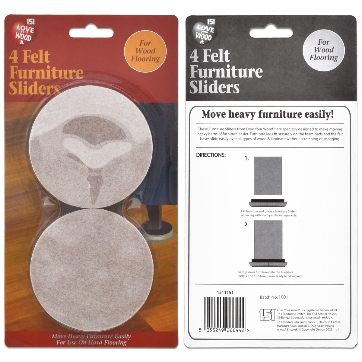 Ideal for moving heavy furniture such as sofas, tables and cupboards across wood and hard flooring, the Felt Furniture Sliders from 151's Love Your Wood range reduce friction and make home rearrangements easy. Suitable for attaching to furniture legs, the Felt Furniture Sliders help to prevent scratches, scuffs and marks on wood, laminate, tile and vinyl floor.