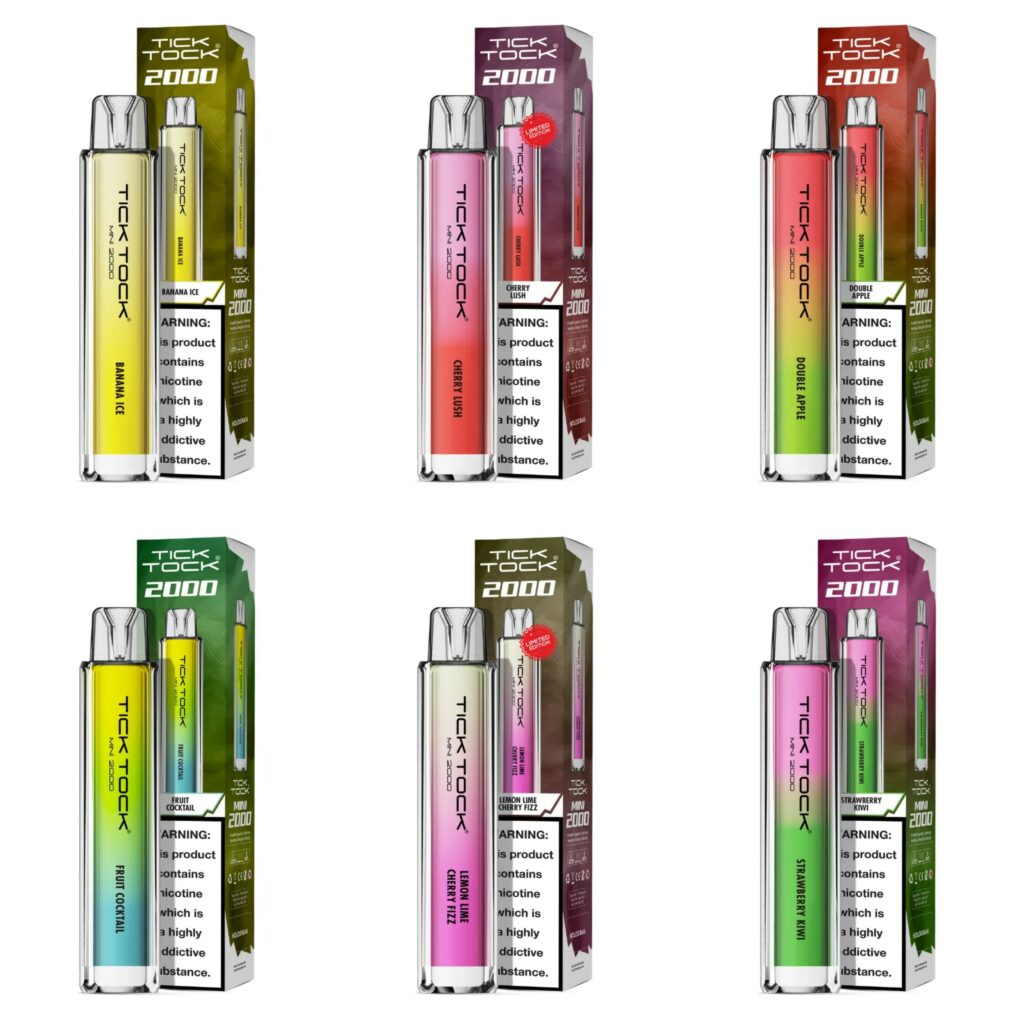 The Tick Tock Mini 2000 Disposable Vape is a compact and stylish vaping device designed for convenience and performance. It offers up to 2000 puffs, supported by a robust 600mAh rechargeable battery with fast USB-C charging, ensuring extended use and quick power replenishment. The device features a 2ml e-liquid capacity filled with 20mg nicotine salt, delivering smooth and satisfying hits through a 1.0-ohm mesh coil that enhances flavour consistency without harsh aftertastes. Its small size and premium crystal-gradient finish make it highly portable and durable, fitting easily into pockets while maintaining a high-end aesthetic.