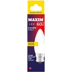 Maxim led candle light bulb 7.5w-60w warm white bayonet x10 a+ energy rating. 7.5 kwh/1000h. 806 lumens. warm white 2700k. avg life: 15,000 hours. switch cycles: 7,500. length 99mm. depth 37mm. not dimmable. instant full light.