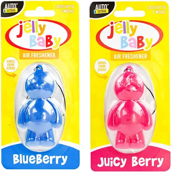 Freshen up your vehicle with a Jelly Baby Air Freshener which is bursting with fragrance and conveniently hangs in all vehicles thanks to the attached string. The air freshener can last up to 6 weeks. You can also use this air freshener in the home and the office and comes with a blueberry or juicy berry scent.