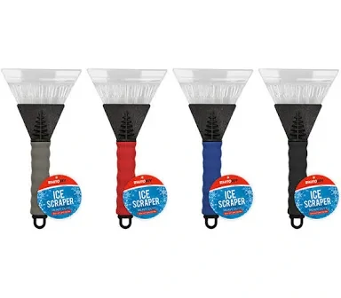 The ice scraper is tough and durable and features a heavy duty plastic scraping blade that will easily remove ice from car windows.