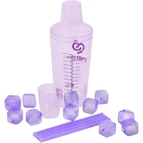 This 500ml cocktail shaker kit includes 12 reusable ice cubes and four straws and has 3 popular cocktail recipes printed on the side. Constructed from lilac PS material, the shaker measures 23cm high x 8.5cm in diameter.