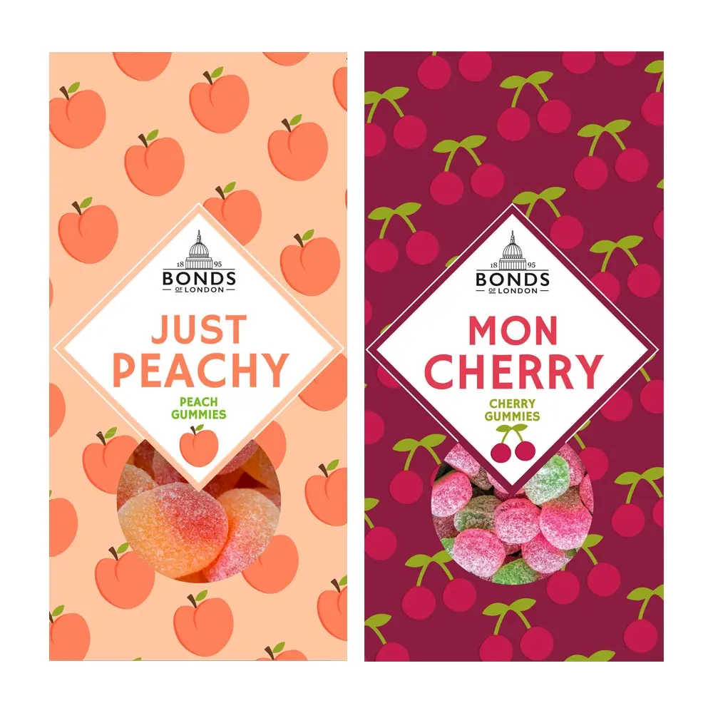 Just Peachy: Sugar, Glucose syrup, Water, Pork Gelatine, Maltodextrin, Acid (Citric acid), Flavouring,Vegetable concentrates (Black carrot juice concentrate), Colour (Curcumin, paprika extract).