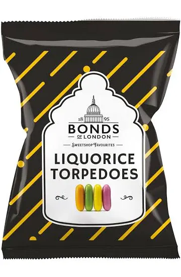 Wheat Flour (Wheat Flour, Calcium Carbonate, Iron, Niacin, Thiamin), Sugar, Treacle, Dextrose, Glucose Syrup, Modified Tapioca Starch, Colours (Anthocyanins, Mixed Carotenes, Curcumin), Vegetable Oil (Palm, Sunflower), Glazing Agents (Shellac, Canauba Wax), Liquorice Extract (1%), Plant Concentrates (Safflower, Spirulina), Aniseed Oil.