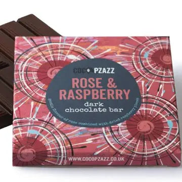 Dark Chocolate: cocoa mass, sugar, cocoa butter, emulsifier: SOYA lecithin, natural vanilla, dried raspberry pieces (2%), rose extract (0.1%): emulsifier (polysorbate 80, rose extract, geranium extract, rhodinol, geraniol and palmarosa extract).