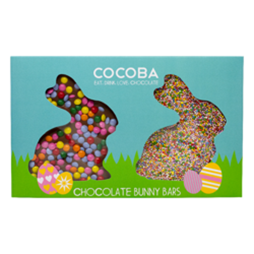 A delicious duo of chocolate bars, handmade especially for Easter! Made from Belgian milk chocolate in the shape of Easter bunnies, and decorated with crunchy sprinkles and vibrant candy pieces.
