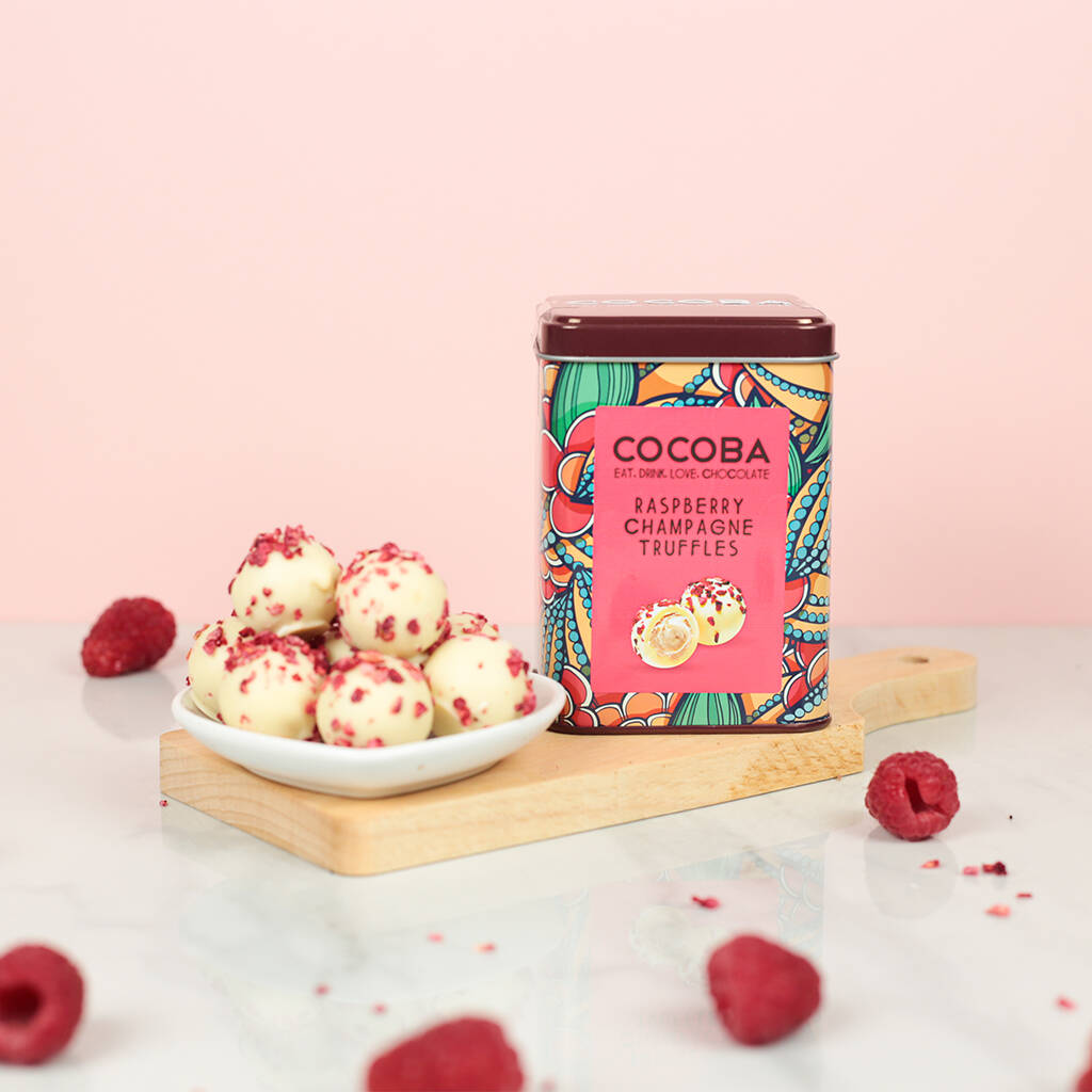 A beautifully colourful gift tin filled with white chocolate truffles with a raspberry & Marc de Champagne filling, and topped with freshly freeze-dried raspberries.