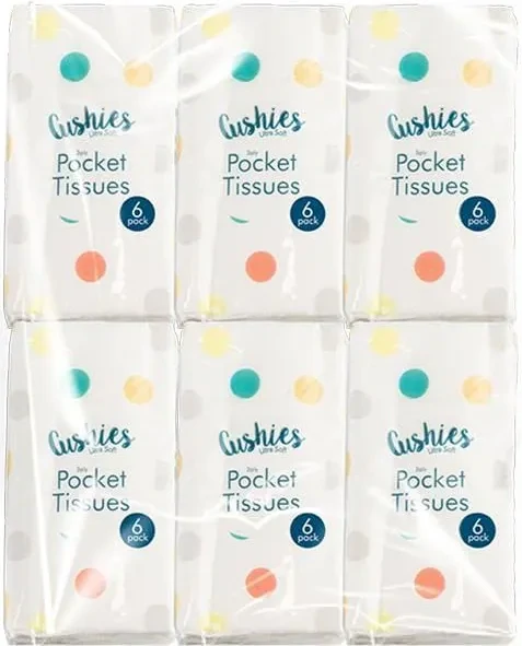 An essential for colds, allergies and irritation, the Cushies Pocket Tissues includes six pieces per pack, and are retail shrink wrapped as six packs.