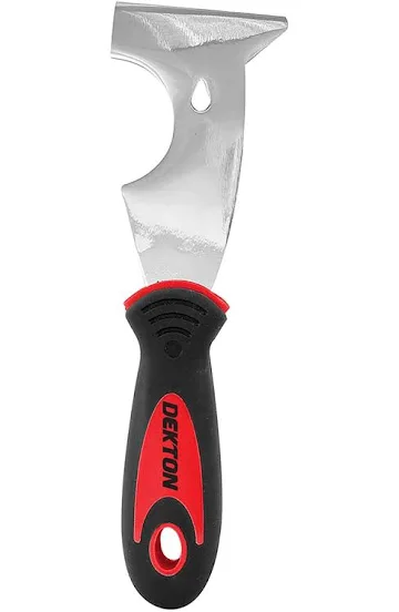 Wallpaper scraper, crevice scraper, paint roller cleaner and nail remover. Ergonomic rubber grip handle for comfort. Heavy duty stainless steel blade.