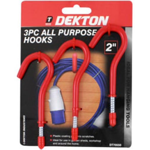 Our wide range of Dekton Hooks are great for use in the shed, garage or home. They are useful for a wide variety of purposes including hanging tools, bikes, wood, furniture, ladders, water hoses and more. They're durable and they're plastic coated to avoid scratching your belongings.