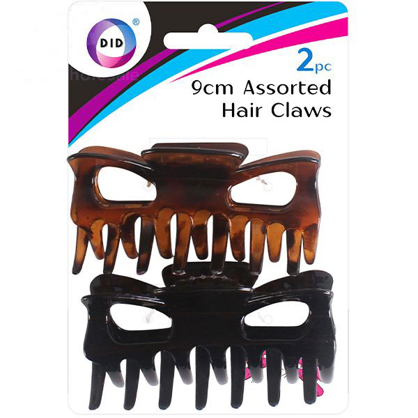 The DID Assorted Hair Claws 9cm 2 Pack is a product that includes two large, 9cm hair claws for gripping and styling hair. These clips are described as having a robust mechanism, suitable for holding various hair types, and come in assorted colours like black and brown. They are also noted for being easy to use and having smooth edges to be gentle on the hair and scalp.