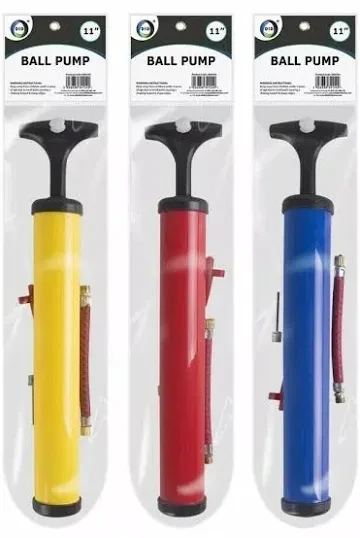 The DID Ball Pump 11" is a hand pump, typically available in assorted colors like yellow, red, and blue, that comes with adapters and valves for inflating various sports balls and potentially bike tires. It's a versatile tool for inflating footballs, basketballs, and other inflatable sports equipment.