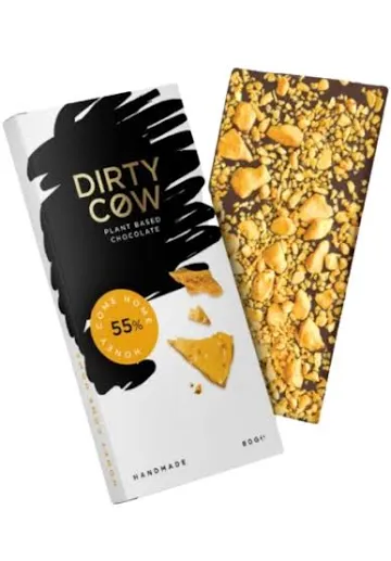 Dirty cow chocolate (55% cocoa mass, sugar, cocoa butter, soy lecithin, natural vanilla), honeycomb pieces (sugar, glucose, syrup, sodium bicarbonate).