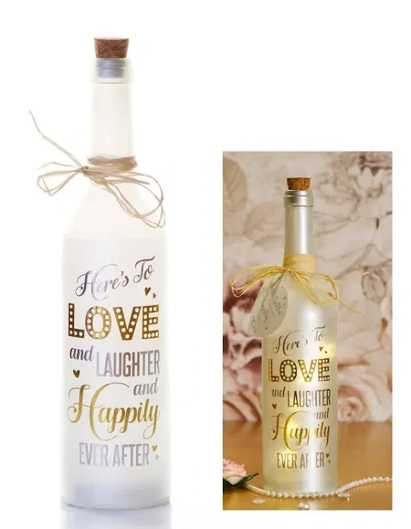 Here's to love and laughter and happily ever after. The Starlight Bottle is a charming, beautiful gift for friends, family and loved ones. An incandescent design that's resplendently decorated with text and craft, the Starlight Bottle is a wonderful home decoration or can be used for weddings and parties. Light Up (3 X AAA Batteries not included) 'Happily Ever After' A sparkling design decorated with silver and gold text, the Starlight Bottle contains battery-powered LED lights.