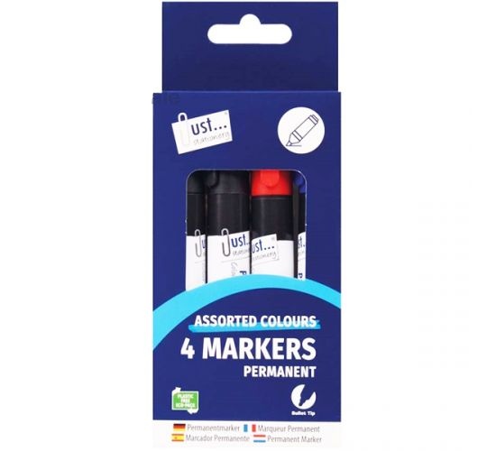 The Just Stationery 4 Permanent Markers with Bullet Tips are versatile tools for marking on a wide range of surfaces. These markers deliver bold, fade-resistant ink that dries quickly to prevent smudging. The bullet tip design allows for precise lines, making them ideal for labelling, crafting, and decorating.