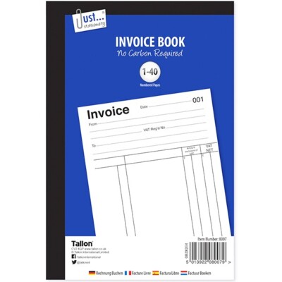 The Just Stationery Invoice Book includes 40 numbered carbonated pages. With everything from invoice date, from, to and VAT registration number, the pre-printed Invoice Sheets include columns for values and net VAT values for