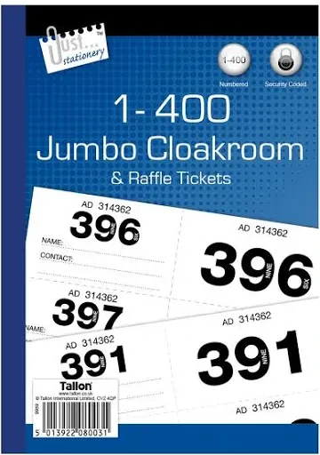 Discover the exceptional quality of this product, ideal for fundraisers, events, raffles and cloakrooms, the just stationery jumbo raffle tickets include 400 security coded numbered pages with name and contact details fields.