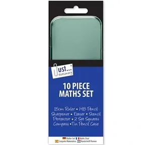 The Maths Set includes a compass with pencil, 15cm ruler, rubber and sharpener, protractor, two set squares anda stencil.
