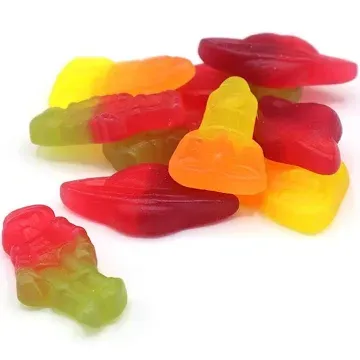 Sugar, glucose syrup, wheat starch, water, modified maize starch, modified potato starch, acids (lactic acid, malic acid, citric acid), flavourings, fruit and vegetable concentrates (spirulina, safflower, black carrot, grape), colours (curcumin, paprika extract), vegetable oils (coconut), glazing agent (carnauba wax).