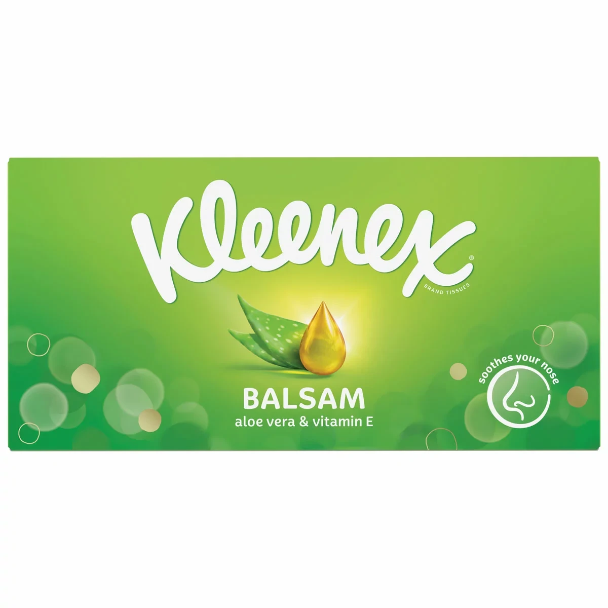 Kleenex Balsam Facial Tissues contains Balmcare™ with Aloe Vera, Vitamin E and Calendula. A protective balm is left behind to help give superior soothing for the toughest colds and provide comfort on delicate skin. These tissues have been dermatologically tested, making them safe to use on even the most sensitive skin.