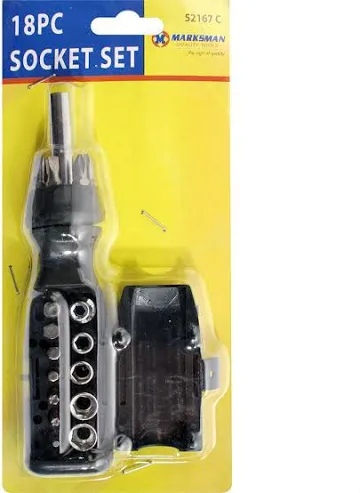 The marksman socket set includes a srewdriver, an assortment of bits and socket for general DIY work automotive and bicycle repairs.