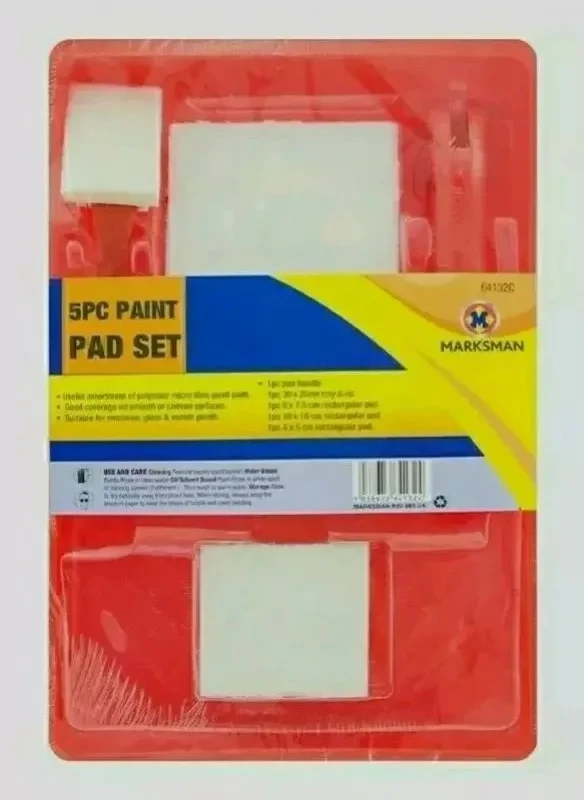 The Marksman Paint Pad Set includes a Pad Handle three rectangular paint pads and a tray with lid. Providing excellent coverage on smooth or uneven surfaces, the Marksman Paint Pads are suitable for emulsion, gloss and varnish paints. 5pc 1 X Paint Pad Handle 1 X 30 X 20cm Tray & Lid 1 X 6 X 7.5cm Rectuangular Pad 1 X 10 X 15cm Rectangular Pad 1 X 4 X 5cm Rectangular Pad Ideal for minor touch-ups where paint brushes are not required, the Marksman Paint Pads are ideal for adding a dab of paint to walls, ceiling, door panels and edges.