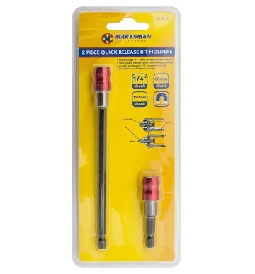 The Marksman 2pc Quick Release Bit Holders feature a quick-change 1/4" shank hexagon drive for fast and efficient bit changes. Each holder is equipped with a built-in magnet to securely hold the bits in place, while still accommodating all standard 1/4" hexagon driver bits. Enjoy a reliable, hassle-free bit-swapping experience.
