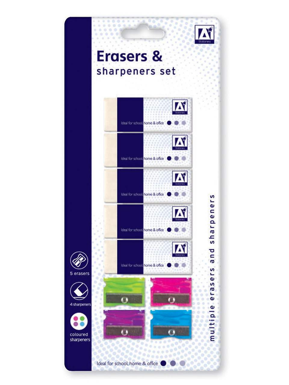 Discover the exceptional quality of this product, the erasers & sharpeners set includes five erasers and four sharpeners in assorted colors. perfect for sharpening pencils and erasing pencil marks, this set is essential for school exercises and sketching.