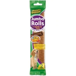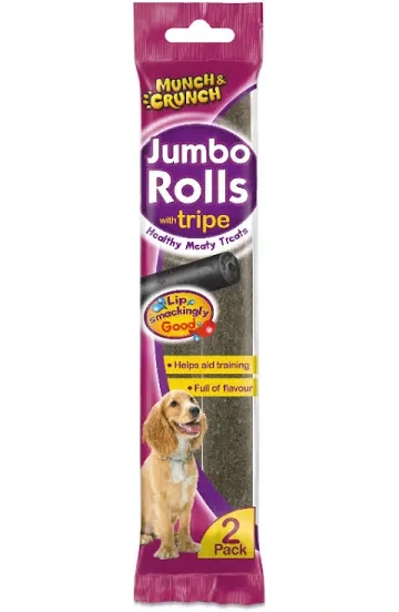 Munch & Crunch Jumbo Rolls. Full of flavour and with 100% natural ingredients, Jumbo Rolls are a healthy meaty treat which can be given at any time of day as a tasty reward. Always supervise when feeding and keep fresh water available.