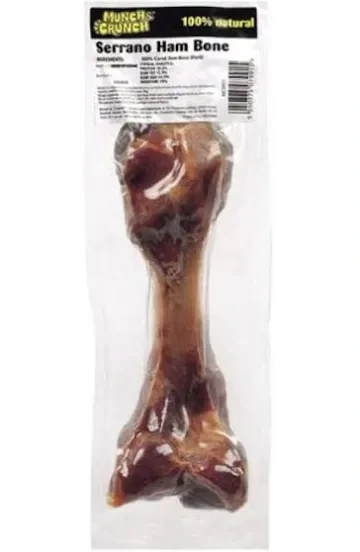 Munch & Crunch - Serrano Ham Bone Ingredients: 100% cured ham bone. Protein: 30.8% Raw fat: 12.9% Raw ash: 44.9% Moisture: 19% Complementary food for dogs.