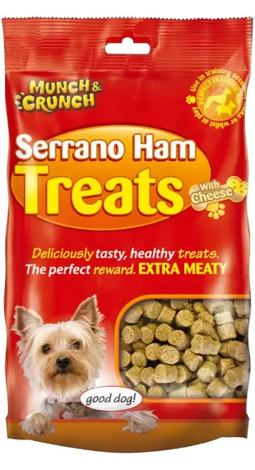 The Munch & Crunch Serrano Ham Dog Treats are delicious, healthy treats for ravenous dogs. With an extra meaty flavour and munchy texture. Nutritious and extra meaty, the Serrano Ham Dog Treats are the perfect size for treating dogs on walks!