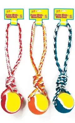 Available with three assorted colour combinations, the Pets Play Jumbo Ball with Rope is ideal for games, fetch, tug contests and satisfying dogs' natural instinct to chew. With a textured material to soothe the teeth and gums, the Jumbo Ball with Rope is a robust, durable design that's suitable for dog training activities and outdoor walks. 3 Assorted Colours Jumbo With a handle for easy throwing, the Pets Play Jumbo Ball with Rope Dog Toys are bright, vibrant designs that are easy for pet owners to spot in dark conditions.