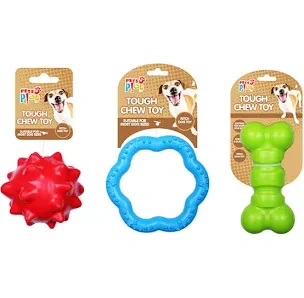 The Pets Play Tough Chew Toy are high durable fetch toys for energetic pooches! Available with three assorted designs, with various textures and ribbed patterns to soothe sore gums, the Tough Chew Toys satisfy dogs’ natural urge to chew whilst promoting healthy dental hygiene by reducing plaque and tartar build-up. 3 Assorted Designs Suitable for Most Dog Breeds & Sizes Perfect for fetch, tug-and-pull and solo chewing, the Tough Chew Toys help to keep teeth clean and jaws strong.