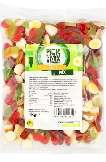 Glucose Syrup, Sugar, Fruit Juice from Concentrate (Grape, Pear, Pineapple, Peach), Beef Gelatine, Humectant (Sorbitols), Corn Starch, Acid (Citric Acid), Gelling Agent (Pectins), Fruit and Vegetable Concentrates (Safflower, Spirulina, Carrot, Apple, Hibiscus, Molasses, Blackcurrant, Lemon), Flavourings, Glazing Agent (Carnauba wax, Bees Wax), Colours (Curcumin, Paprika Extract)