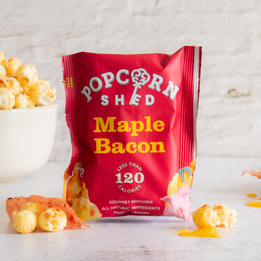 Popped Corn (29%), Sugar, Glucose Syrup, Butter (Milk), Bacon Flavoured Soya Bits (3.8%) (contains: Soyabean Protein, Sunflower Oil, Salt, Dried Beetroot, Flavouring (including Smoke Flavouring), Maltodextrin, Wheat Flour (Gluten), Colours (Carmine, Paprika Extract), Anti Caking Agent (Magnesium Carbonate)), Rapeseed Oil, Salt, Emulsifier: Sunflower Lecithin, Raising Agent: Bicarbonate of Soda, Natural Flavouring.