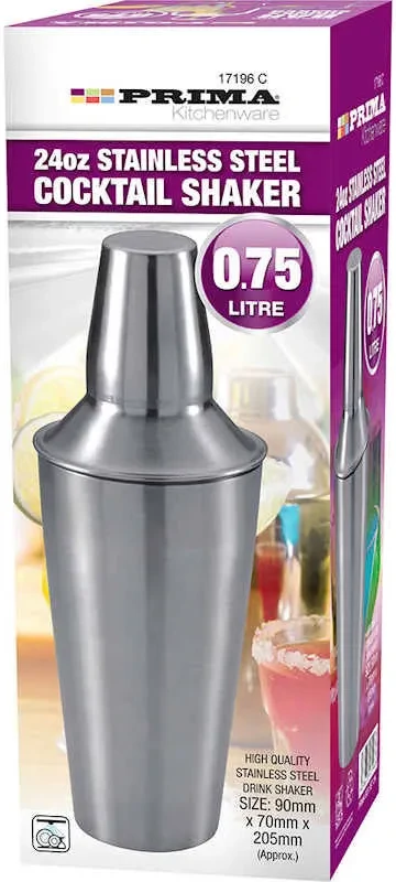 Whether it's a martini, margarita or daiquiri, you choose! Great for cocktails and mocktails, the Prima Stainless Steel Cocktail Shaker includes lid for shaking and a strainer for pouring into glasses. 0.75L 24oz Stainless Steel 9cm X 7cm X 20.5cm The Prima Stainless Steel Cocktail Shaker is an essential for parties and celebratory occasions. Simply add ingredients, mixers and ice and shake!