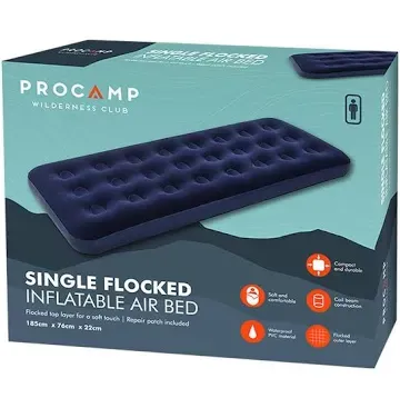 Procamp Single Flocked Inflatable Air Bed 185cm x 76cm x 22cm