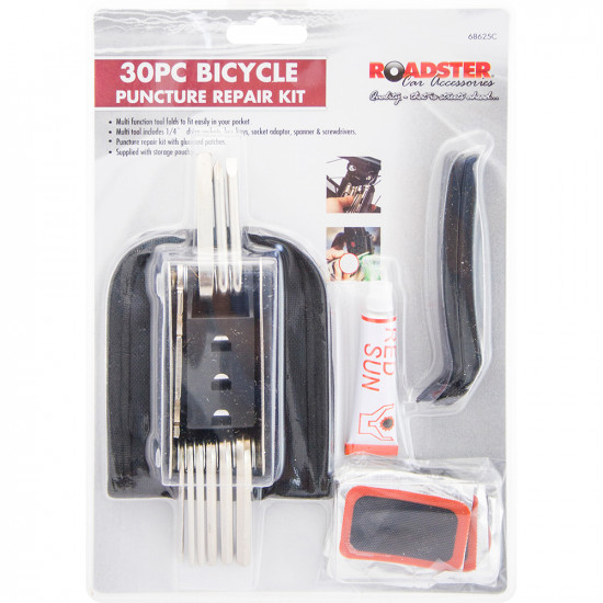 The Roadster Bicycle Puncture Repair Kit includes a multi-function tool which contains hex keys, socket adapter, spanner and screwdrivers for an array of bike maintenance tasks. The Multi-function tool neatly folds away, and is supplied with a storage pouch for when you're cycling. 30pc 1 X Multi-functional Tool 2 X Tyre Levers 1 X Rubber Cement Tube Includes Pouches The kit also includes tyre levers for removing inner tubes for bike tyres and rubber cement and pouches for repairing minor punctures. Quick, easy and practical, the Roadster Bicycle Puncture Repair Kit is a must-have for keen road or mountain bike cyclists.