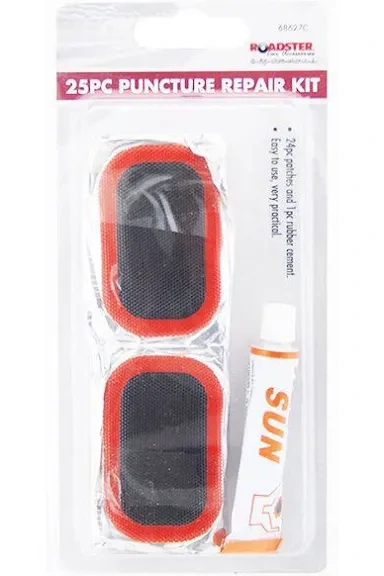 The Roadster 25pc Puncture Repair Kit includes 24 pouches and rubber cement tube for repairing punctures to bike inner tubes.