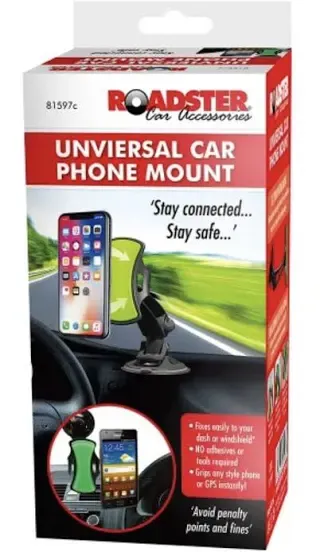 The Roadster Universal Car Phone Mount fixes easily to car dashes or windscreens with a suction cup design
