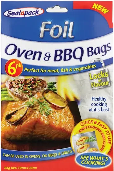 Lock in moisture, flavour and heat food evenly with these handy disposable foil Oven bags, each pack contains 6 bags which can be used in ovens, BBQs & Grills to cook vegetables meat and fish to perfection.