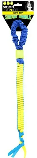 The Smart Choice Bungee Woven Rope Tug Toy is a stretchy, robust design that satisfies dogs' natural instinct to chew. With a strong nylon profile, the blue and yellow Woven Rope Tug Dog Toy is perfect for contests of tug and pull.