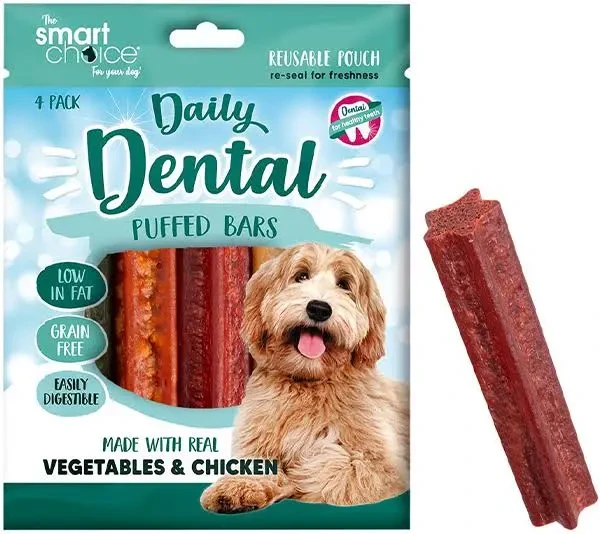Enriched with the natural flavour and nutrients of vegetables and chicken, the Daily Dental Puffed Bars from the Smart Choice range are easily digestible snacks for hungry dogs.