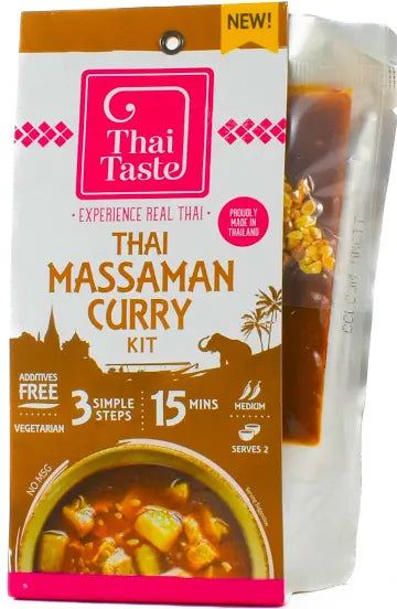 This easy Massaman Curry Meal Kit brings you real and authentic tastes of Thailand with all of the ingredients including lemongrass, galangal and turmeric being freshly produced in Thailand.. This combined with Thai Taste's silky, creamy coconut milk allows you to create Thailand’s favourite spicy, aromatic curry in the comfort of your own home.. Ideal with any type of meat, seafood, eggs, tofu or vegetables and served with a bowl of steaming fragrant rice. Suitable for vegetarians.