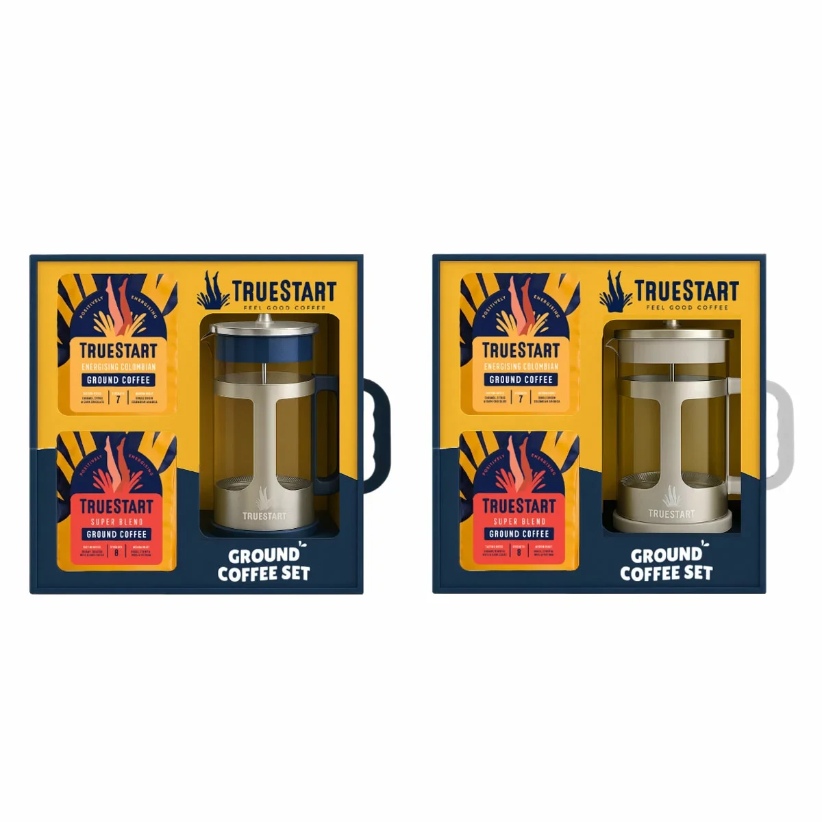 The TrueStart Cafetière & Ground Coffee Set combines premium-quality coffee with a durable, stylish cafetière for the perfect brewing experience. Each blend of TrueStart coffee is crafted for smooth, vibrant flavor, made from 100% Arabica beans and roasted to perfection. Enjoy café quality coffee at home with this complete set designed for taste, freshness, and convenience.