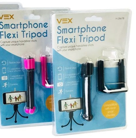 Flexible Legs · Compatible With Most Phones · Compatible With Most Cameras · Portable · 3 Assorted Colours in Black/Blue, Black/Pink or Black/Silver.