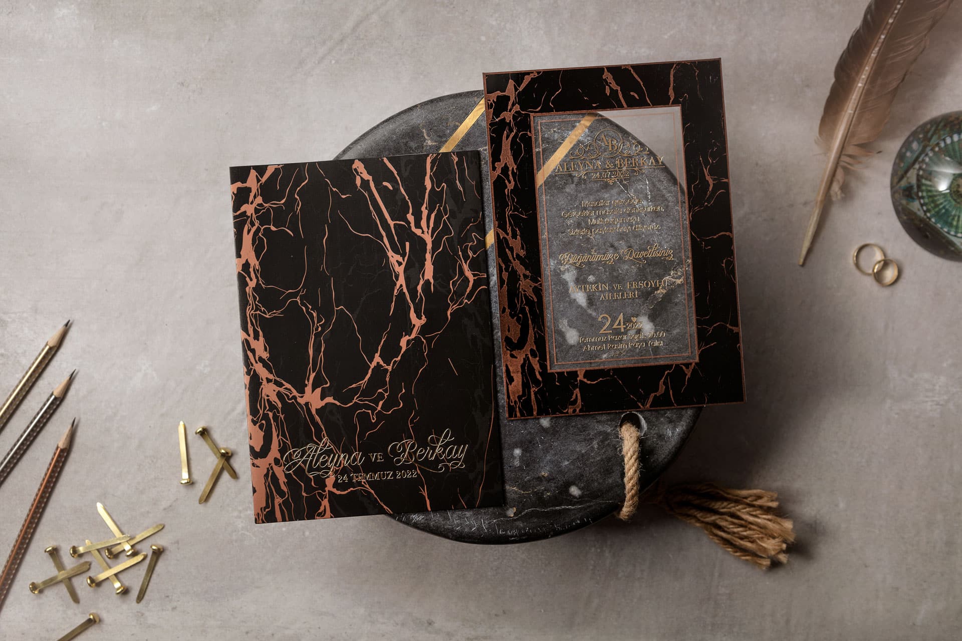 Inner print of the invitation includes the printing of the bride and groom names, invitation text, family names, date, time, and address information on the inside of the invitation.