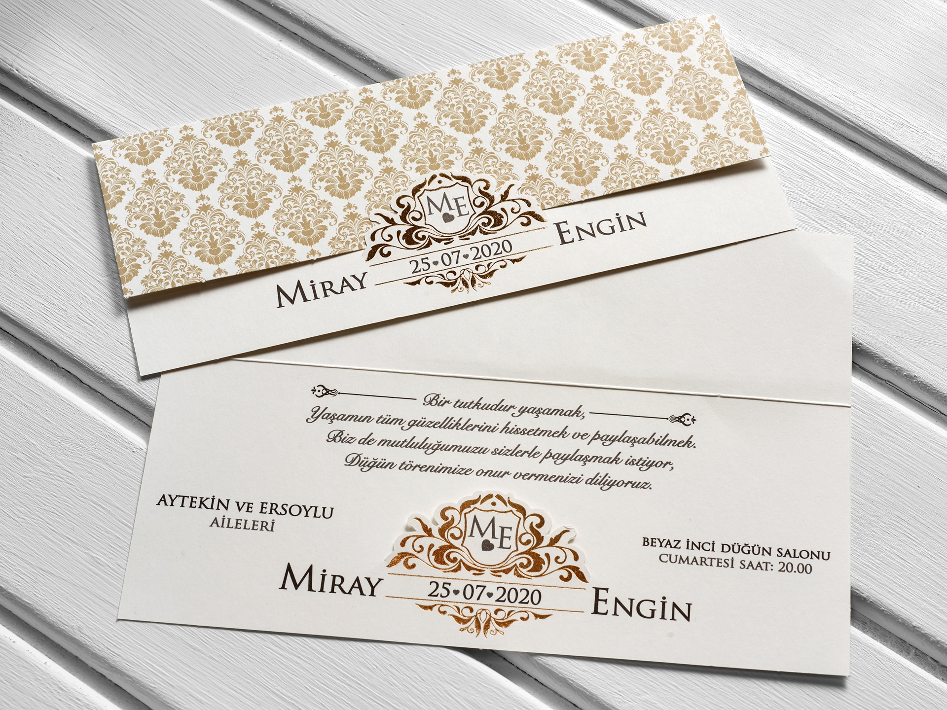Inner print of the invitation includes the printing of the bride and groom names, invitation text, family names, date, time, and address information on the inside of the invitation.