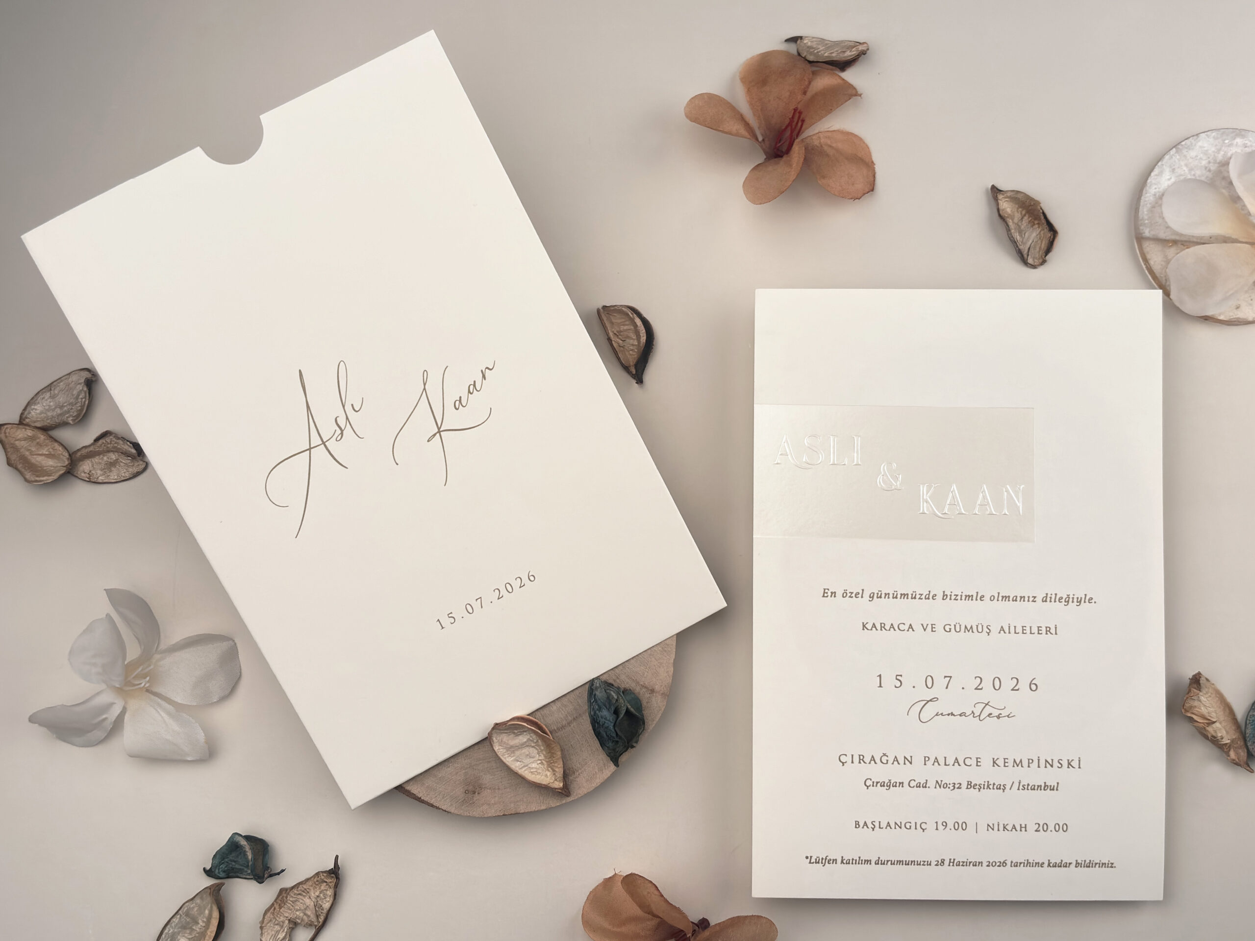 Inner print of the invitation includes the printing of the bride and groom names, invitation text, family names, date, time, and address information on the inside of the invitation.