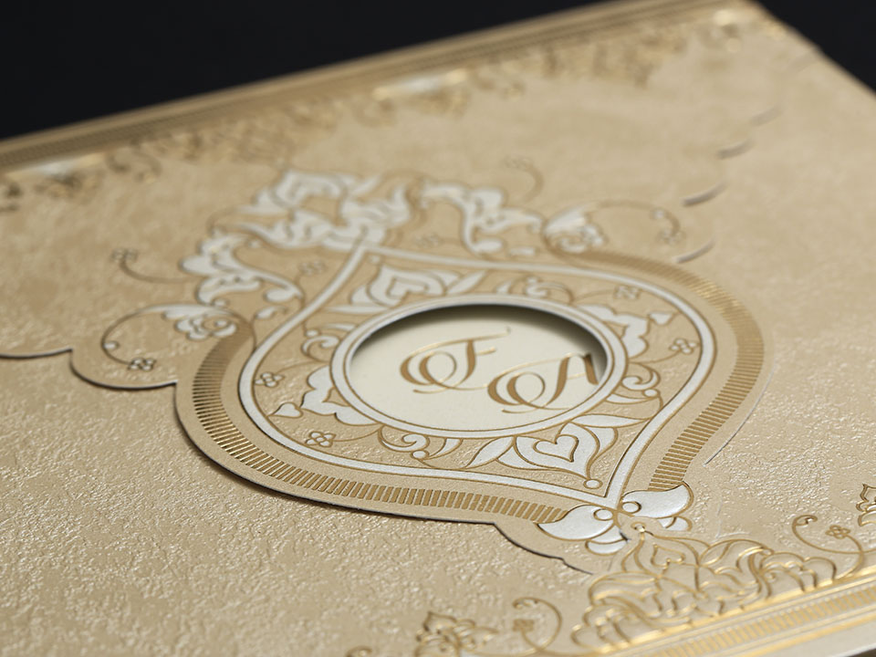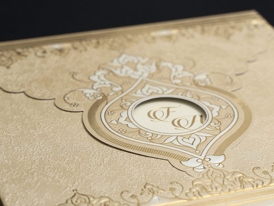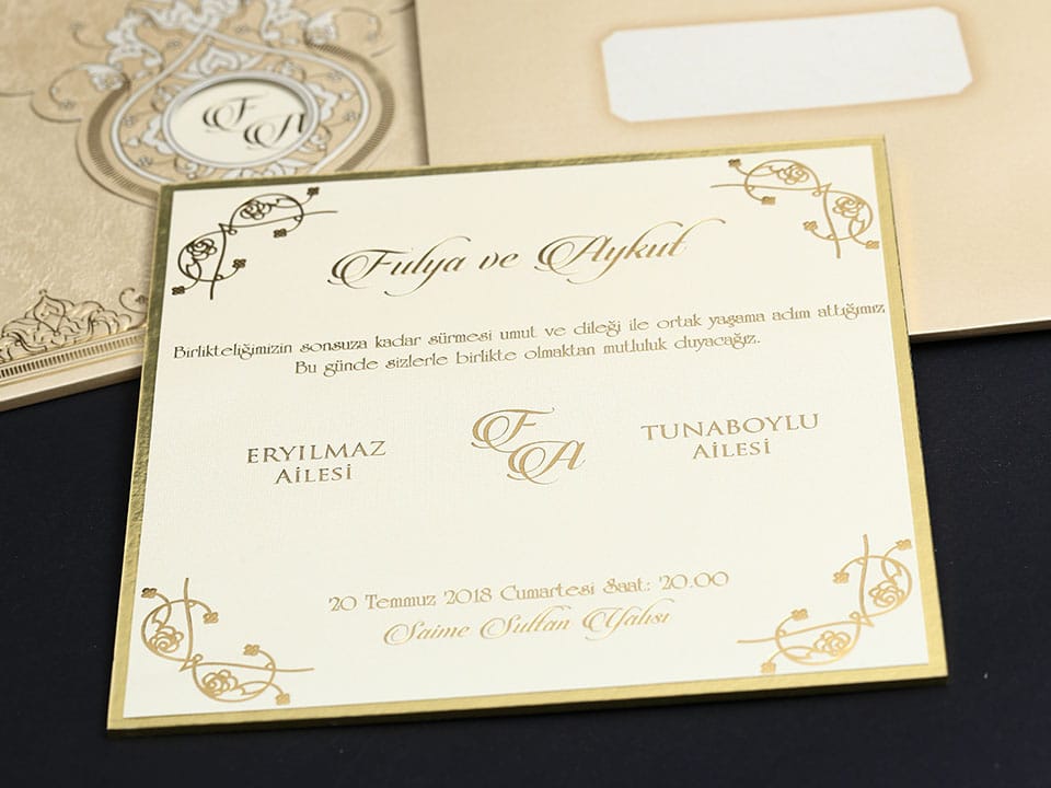 Inner print of the invitation includes the printing of the bride and groom names, invitation text, family names, date, time, and address information on the inside of the invitation.